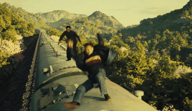 比如郭鹏飞在火车顶上和扒手单打独斗,在飞奔的火车顶上,平缓“提高”,风力对他皆备不起作用,牛顿见了都得说一声好。