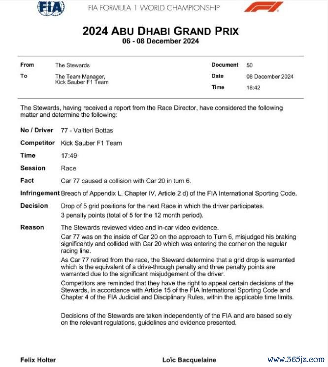 赛后,F1官方阐发,博塔斯因激勉与马格努森的碰撞,被罚下一场比赛退后5位发车,同期超等驾照扣3分。