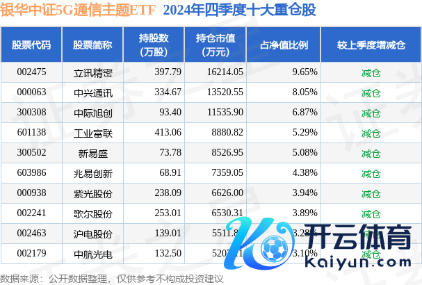 银华中证5G通讯主题ETF为指数型-股票基金,凭据最新一期基金季报判辨,该基金财富竖立:股票占净值比98.7%,无债券类财富,现款占净值比1.4%。基金十大重仓股如下: