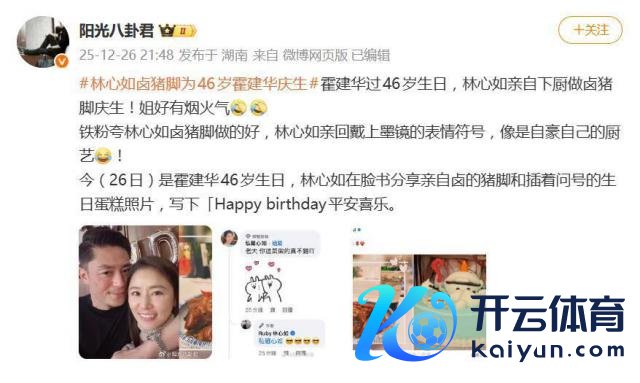 12 月 26 日,霍建华迎来 46 岁寿辰。浑家林心如莫得继承挥霍派对或高调广告,而是在酬酢平台晒出了一盘我方亲手卤制的猪脚、一个插着问号烛炬的雪宝造型蛋糕,外加一瓶红酒,配文精炼:" Happy birthday 吉祥喜乐"。等于这组充满"炊火气"的相片,顷刻间成了网友热议的焦点。