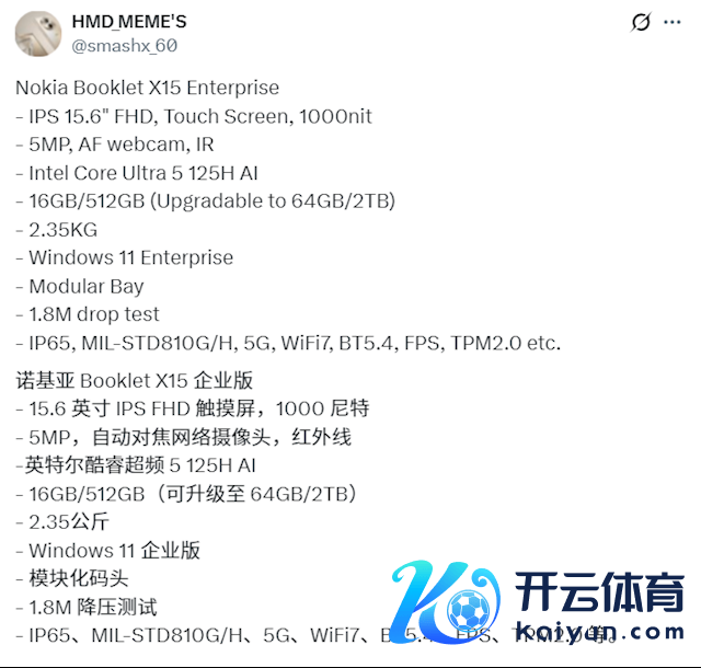 快科技4月15日音信,继曝光诺基亚Mission-Safe Phone 2三防手机后开yun体育网,smashx_60又败露了诺基亚Booklet X15 Enterprise三防札记本的首张渲染图和精良规格。